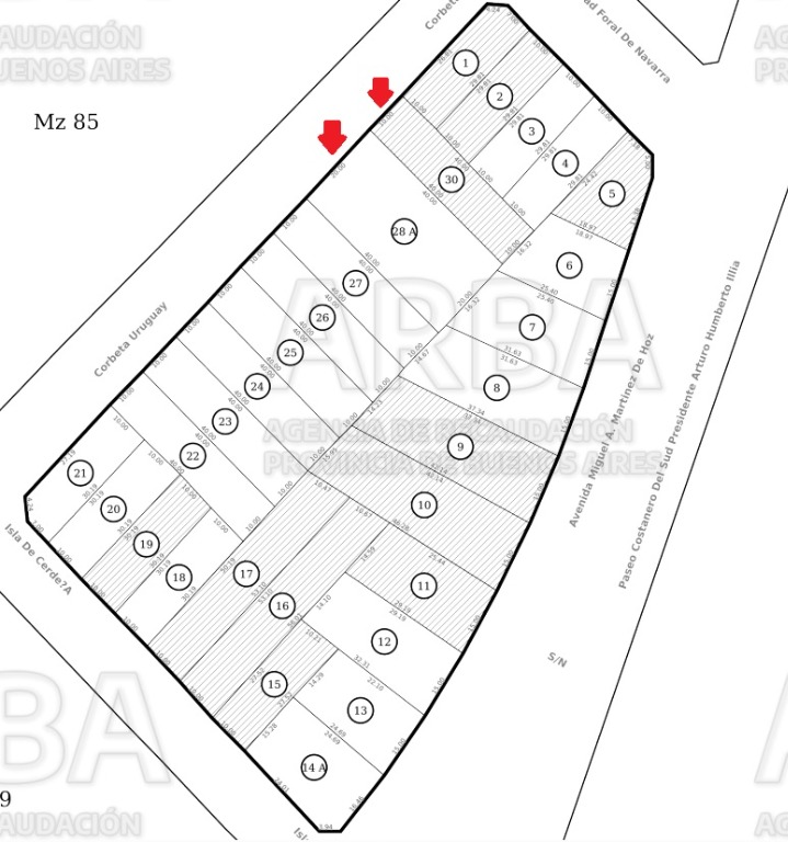 Medidas: 10 metros de frente por 40 metros de fondo. Superficie total: 400 m2. Cuenta con todos los servicios y perímetro cerrado por muros, en su frente portón.